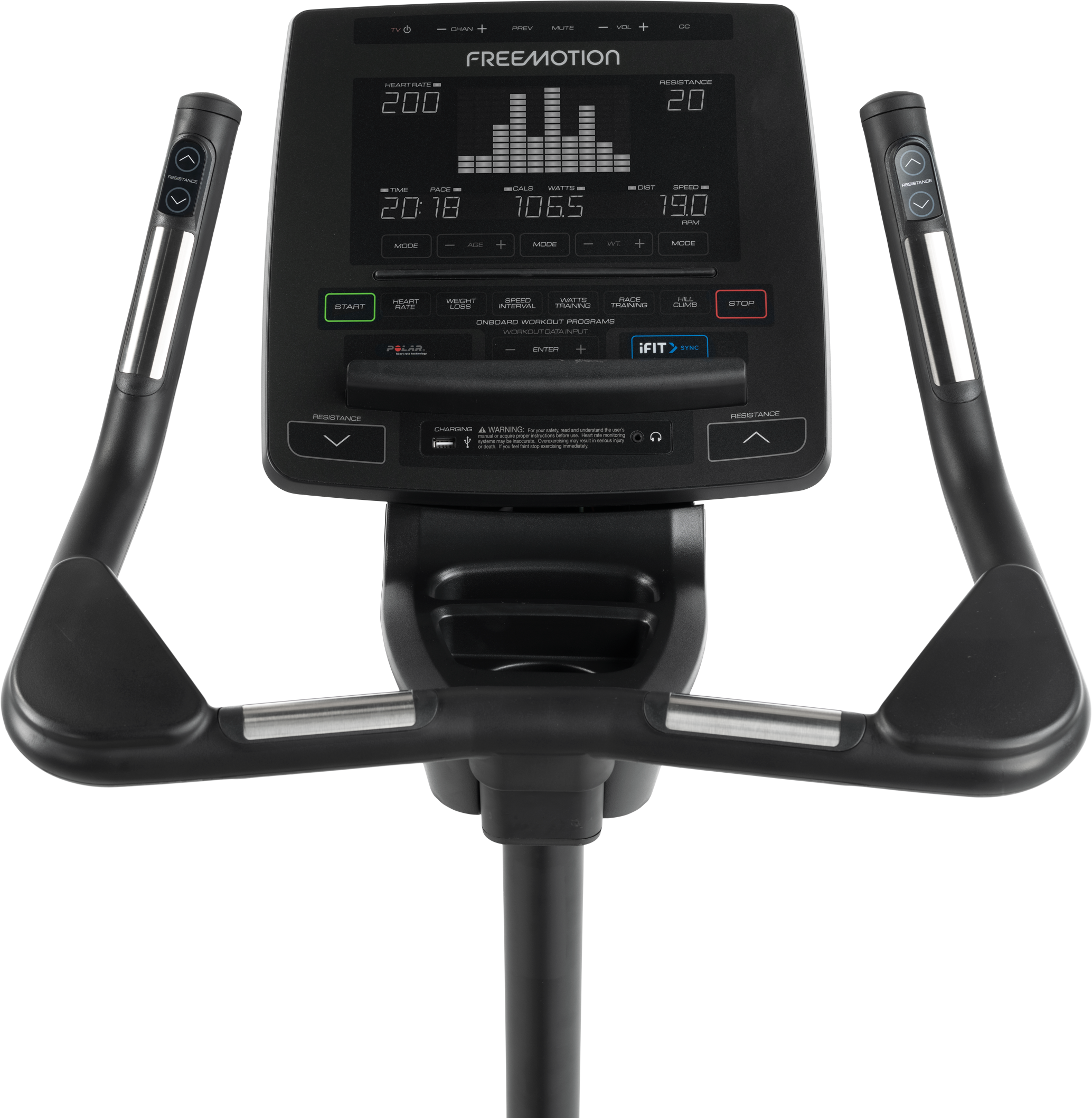 Let hard work be the motivation to keep pressing forward. This bike has a ‘front and center’ simplified user interface that tracks speed, resistance, RPM, distance, calories, time, heart rate, pace and watts.