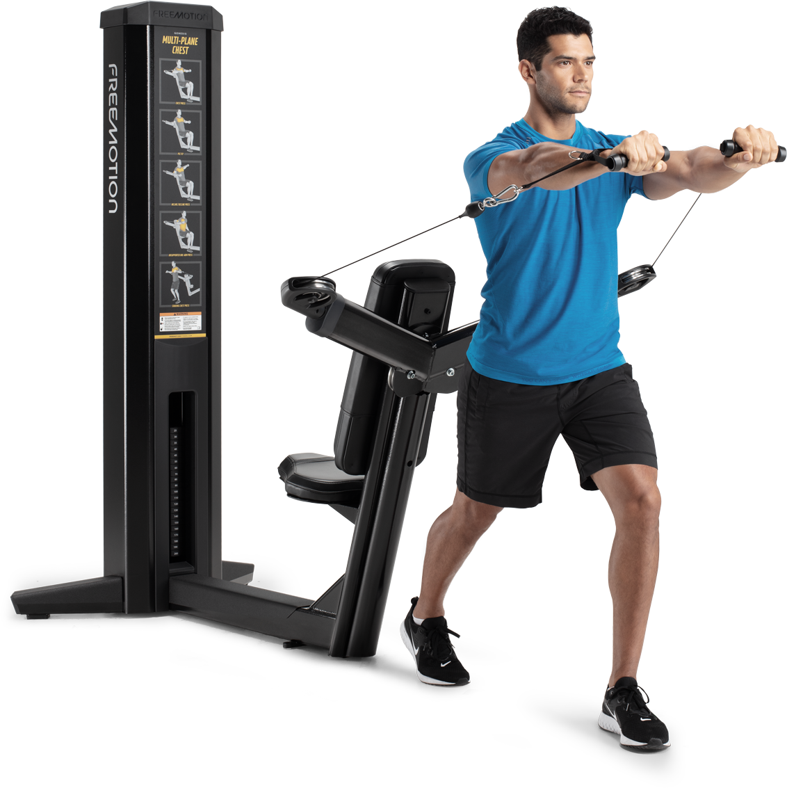 The GENESIS Multi-Plane Chest embodies the best in cable-based functional training. It can accommodate movement progressions from seated to standing and from one arm to two, with full range of motion. This versatility gives trainers (and users) the ability to program just about any sport- or life-specific exercise through all planes of movement. Add a bit more challenge by exercising standing behind the machine, adding rotation or including accessories like stability balls to test balance.